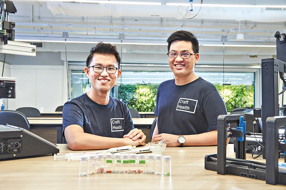 Alumni Goh Wei Jiang (right) and Lim Seng Han (left) saw a growing demand for personalised medicines, especially for the paediatric, elderly and special patient groups when they were PhD students at NUS. To address this demand, the two co-founded Craft Health to market their proprietary 3D printer and formulations.