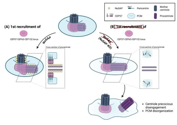 Importantly, NuSAP was shown to be required to bring in a key “ring” of helper proteins (CEP57–CEP63–CEP152 torus complex) that wraps around the centriole and helps keep the two centrioles attached until the right time. The study also showed that NuSAP physically binds to one of these helper proteins, called CEP57, and helps position it early on, just before the cell enters division.