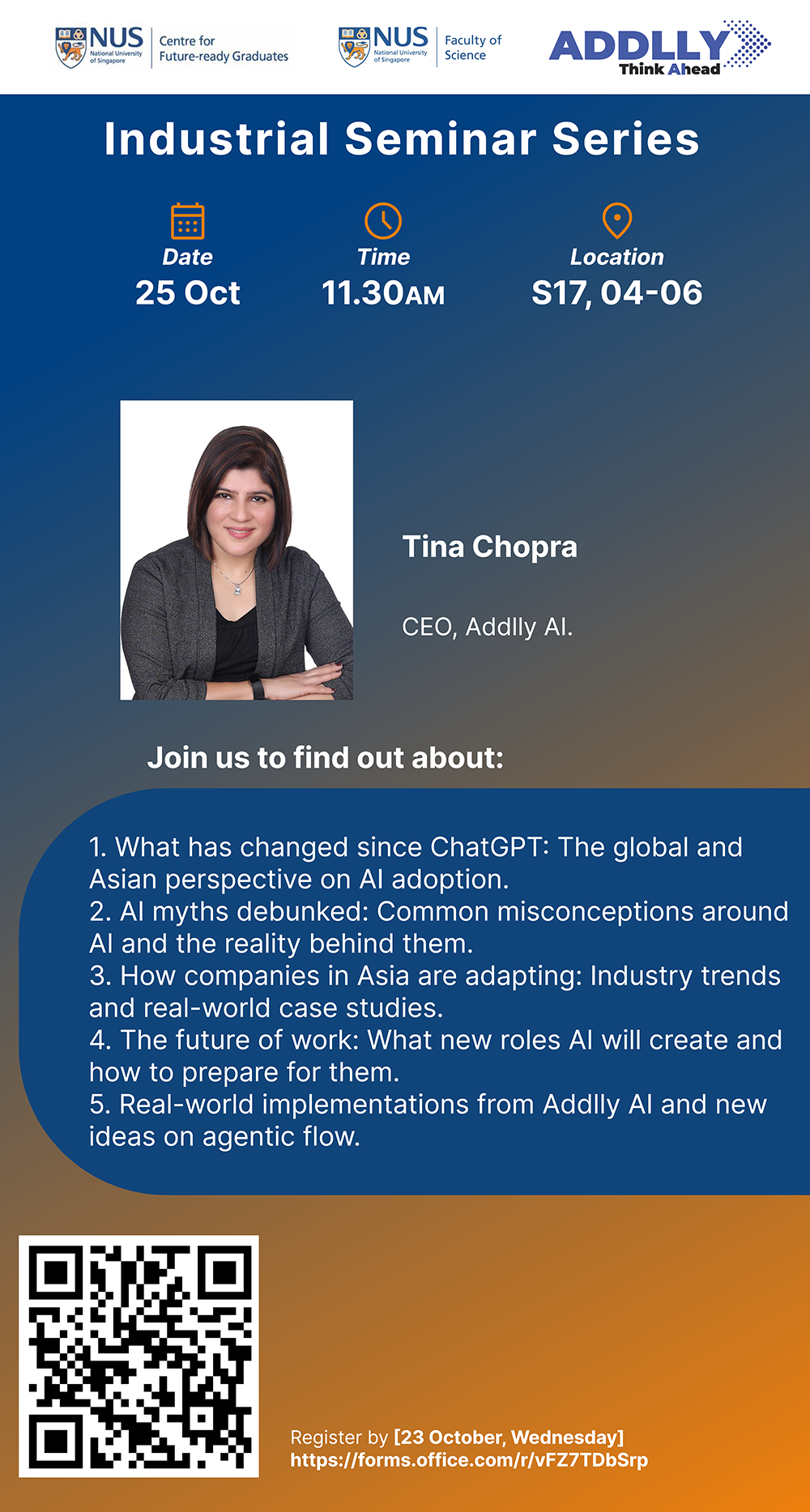 One of the burning questions on almost every student’s mind must be future of the job market in the face of disruptions by AI and Generative AI. Get the low-down from Tina Chopra, CEO of Addlly AI, the builder of custom AI-powered workflow, on challenges and opportunities in an AI-pervasive workplace. Know how Asian companies are adapting, and adopting AI currently with case studies.